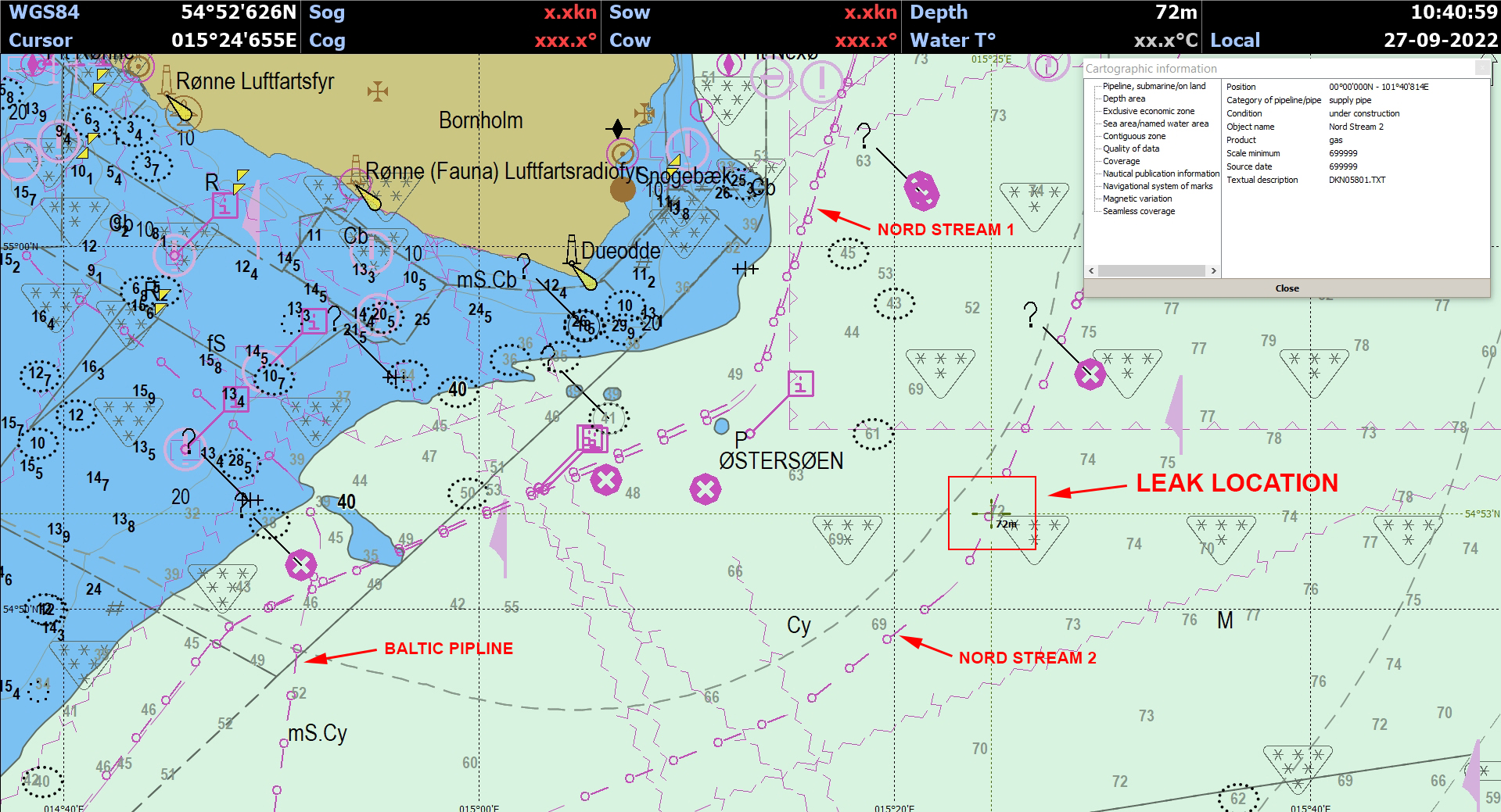 Власти Дании сегодня были проинформированы о падении давления в трубопроводе «Северный поток 2». Предварительная оценка показывает, что произошла утечка из одного из двух трубопроводов «Северного потока 2» в датском районе к юго-востоку от Дуэодде (прим. Dueodde пляж на самой южной оконечности острова) на Борнхольме, координаты 54 52,6N - 015 24,6E, откуда происходит утечка природного газа. Датское морское ведомство выпустило навигационное предупреждение и установило запретную зону в пределах 5 морских миль от трубопровода, поскольку она опасна для морского судоходства.