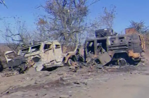 Также на кадрах и уничтоженный украинский "Козак-5". Часть уничтожены нашим десантом в ходе отражения атак ВСУ рядом с селом Давыдов Брод, Херсонской области. (47°12'50.8"N 33°09'57.9"E)