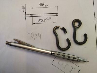 В тизере лежит фото с двумя крючками (один сломан) и некоего чертежа. Почему-то закалённые** крючки сделаны из прутка (проволоки) круглого сечения, а вот на чертеже показано квадратное сечение изделия, к тому-же, очень похоже что это какая-то шайба...