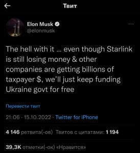 «Черт с ним… хотя Starlink все еще теряет деньги, а другие компании получают миллиарды долларов от налогоплательщиков, мы продолжим бесплатно финансировать правительство Украины», — написал он в своем Twitter. (Пусть спросит совета у оракли, как увеличивать прибыль, а не терять