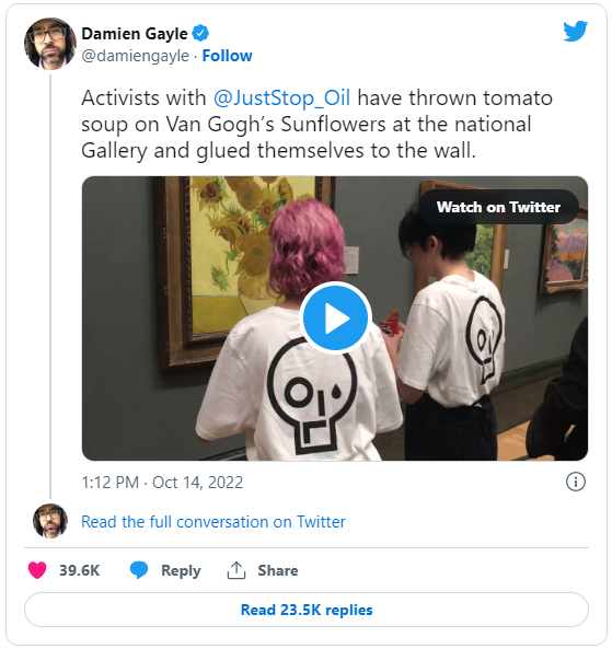 Эта акция имела место вскоре после того, как движение Just Stop Oil провело аналогичный перфоманс, когда два члена группы облили супом культовый шедевр Винсента Ван Гога "Подсолнухи", требуя от правительства остановить все новые нефтегазовые проекты.