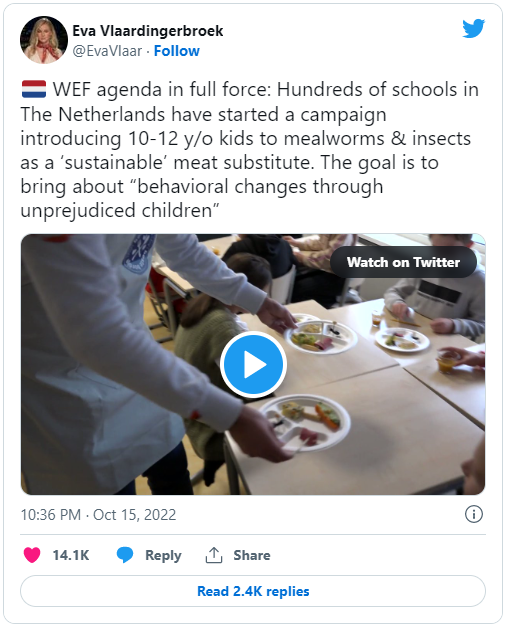 Видео, первоначально записанное голландским видеоблогом на платформе YouTube RTV Oost, на котором изображен улыбающийся "промоутер насекомых" и политик, раздающий мучных червей, люпиновых червей и других насекомых [черви – это не насекомые, но в тексте написано так – прим.пер.] ученикам десяти-двенадцати лет в школе в городе Зволле, распространилось по различным платформам социальных сетей.