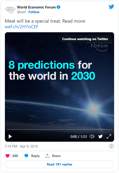 В своих прогнозах на 2030 год WEF, наряду с сообщением о том, что у вас ничего не будет, и вы будете счастливы, заявляет: “Вы будете есть гораздо меньше мяса”, добавляя, что это будет “редкое угощение”, а “не основное блюдо”.