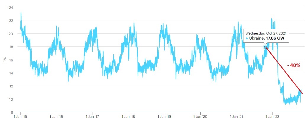 На графике показатель demand (можно перевести как спрос). Обычно, судя по сайтам статистики разных стран, понимается внутреннее производство (в данном случае электроэнергии) за вычетом баланса внешней торговли. Но конечно же без учёта потерь. Каковые именно с учётом направленности ракетных ударов последнего месяца наверняка велики.