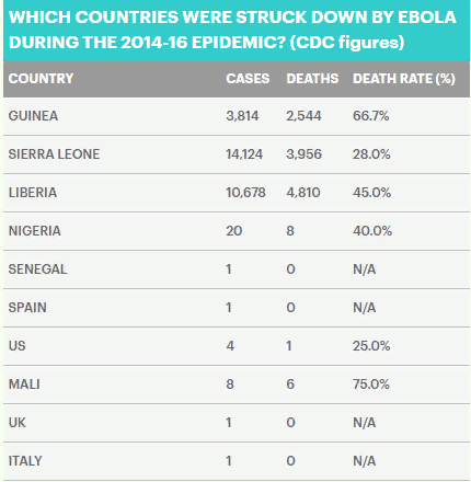 По данным CDC (The Centers for Disease Control and Prevention- Центр по контролю и профилактике заболеваний) за 2 года, 2014-16 гг., признанных ВОЗ временем эпидемии Эболы, после официального объявления её завершения в январе 2016 г., в мире было зарегистрировано 28 652 случая заболевания ею, причем все, кроме 36, произошли в Гвинее, Либерии и Сьерра-Леоне. В общей сложности вспышка привела к 11 323 смертям. Наибольшее количество смертей пришлось на Либерию- около 40%.