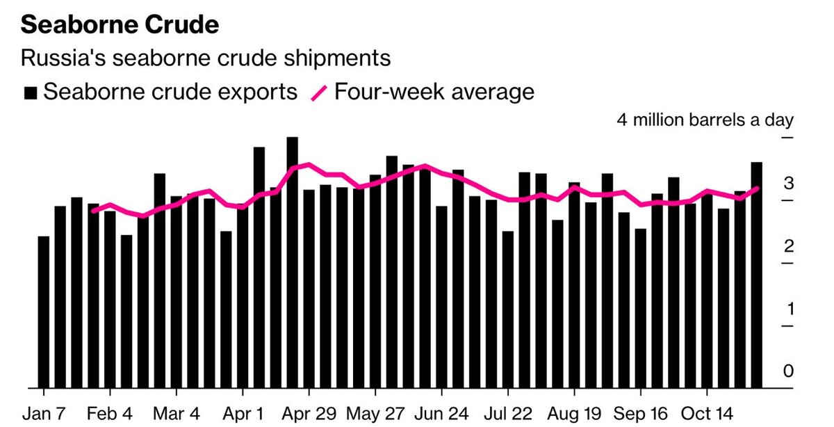 Собственно, основная неприятность для нас и была бы именно в первое время. Однако ситуация повернулась иначе. Российские морские перевозки сырой нефти на прошлой неделе подскочили до пятимесячного максимума – 3,6 млн баррелей в день, самого высокого уровня с начала июня. Вырос и средний показатель за четыре недели, достигнув максимального значения с августа. Причём наибольшее увеличение было в отгрузках на танкерах, которые не показывают конечный пункт назначения.