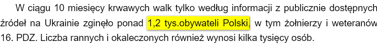 За 10 месяцев кровавых боев только по информации из общедоступных источников на Украине погибли польские граждане, в том числе военнослужащие и ветераны 16-й ПДЗ (Поморской дивизии-прим.Сч.). Количество раненых и искалеченных огромно.
