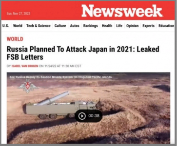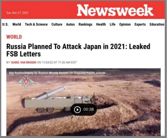 «Уверенность в том, что страны войдут в стадию острого противостояния и даже войны, была высокой. Почему для войны в итоге была выбрана Украина (сценарий не сильно изменился) — это ответ другим», — написал агент ФСБ. Информатор подробно рассказал о передвижении вертолетов радиоэлектронной борьбы, нацеленных на Японию, в то время как российская пропагандистская машина была мощно запущена с целью заклеймить японцев «нацистами» и «фашистами». <…> В августе 2021 года ФСБ рассекретила информацию о пытках советских граждан японскими спецслужбами во время Второй мировой войны. Информатор из ФСБ сообщил, что перед службой поставили задача развернуть «информационную кампанию против Японии в российском обществе». «[Это произошло] резко, внезапно и почти неожиданно», — написал он. Рассекреченные материалы включали данные допроса Отодзо Ямады, генерала японской императорской армии во время Второй мировой войны. «Первоначально, ещё 8 августа, российские СМИ были довольно скупы на комментарии: утверждалось, что Япония готовилась к войне с СССР с 1938 года, вынашивала планы нападения, совершая диверсии», — написал информатор. «Но 16 августа российские СМИ одновременно буквально взорвались, обсуждая рассекреченные документы совсем в другом тоне: якобы японцы проводили ужасные биологические опыты над советскими военнопленными, и крайне плохо обращались с советскими пленными. Подключился и главный рупор международной пропаганды Russia Today». <…> Информатор сообщил, что летом 2021 года в российском информационном пространстве шла «активная раскрутка» против Японии. «Ставка была сделана на то, что японцы специализировались на жестоких биологических экспериментах, проявили бесчеловечность и имели склонность к нацизму. И должны были демилитаризоваться после войны, но нарушают эти правила, создавая риски для России», — пишет он. «Но в целом война для России была неизбежна из-за маниакального стремления руководства к войне. И сейчас основная масса боеспособных частей с этого направления переброшена на Украину», — добавил осведомитель".