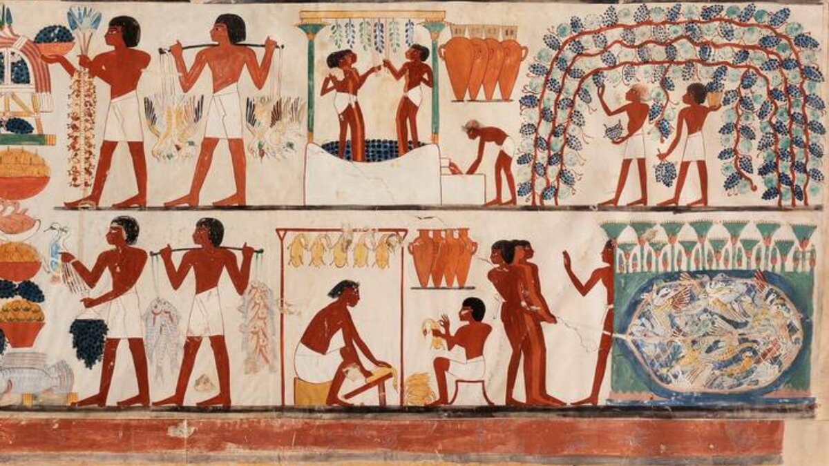 Зато на фресках из гробницы писца и астронома Нахта мы можем увидеть, как эти ягоды выращивали и как производили из них вино. Ну, примерно так же это делают до сих пор в некоторых районах Грузии.