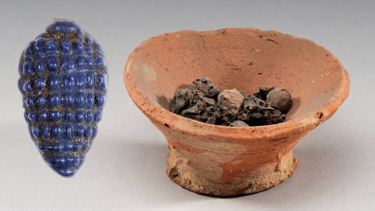 Тут, увы, смотреть почти не на что. Арбузы и дыни, финики и фиги — все превратилось в черные комочки. Вот чашка с инжиром и гроздью винограда из гробницы архитектора Сенмута — в ней лишь угадываются отдельные засохшие ягодки.
