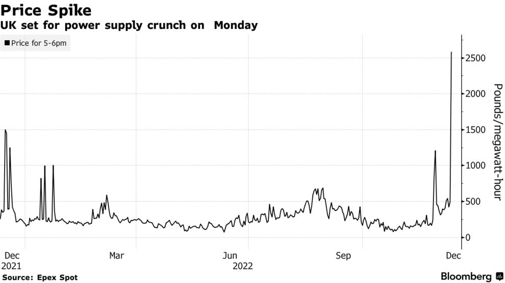 Цены на электроэнергию в Великобритании в понедельник подскочили до рекордного уровня, так как низкие температуры вызовут всплеск спроса, а падение ветровой генерации вызовет кризис предложения.