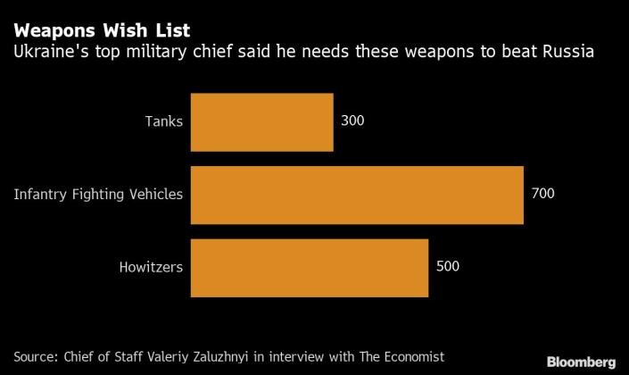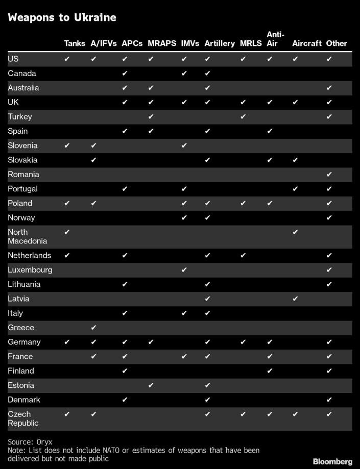 Ниже приводится разбивка некоторых основных систем, которые получила Украина, по данным Oryx, голландского сайта оборонного анализа, а также по заявлениям союзников Украины. Цифры являются приблизительными и не могут быть независимо проверены Bloomberg. Они могут включать обещанное, но не поставленное вооружение, а другое вооружение, не включённое в них, возможно, было поставлены, но не обнародовано.