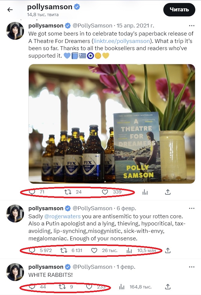 В нем она заявила «К сожалению, @rogerwaters, ты гнилой антисемит по сути. А также лживый, вороватый, лицемерный, уклоняющийся от уплаты налогов апологет Путина, женоненавистник, одержимый завистью и страдающий манией величия. Хватит уже твоих глупостей»