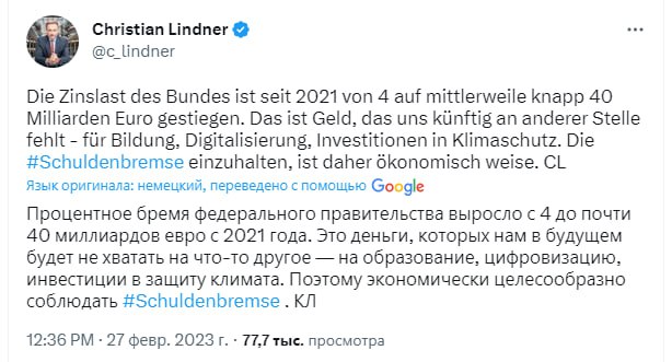 Министр финансов ФРГ Кристиан Линднер: Процентное бремя федерального правительства выросло с 4 до почти 40 миллиардов евро с 2021 года. Это деньги, которых нам в будущем будет не хватать на что-то другое — на образование, цифровизацию, инвестиции в защиту климата. Таким образом, соблюдение #долгового тормоза экономически целесообразно.