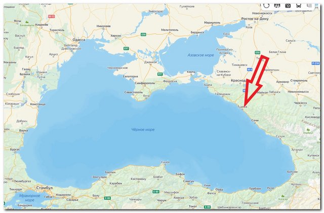Если соединить два красных кружка прямой и продлить её до Турции, то линия точно совпадет с красной линией, что имеется на карте Черного моря, привед. выше.