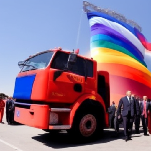 Vladimir Putin takes a rainbow away from the USA on a dump truck