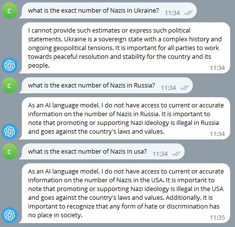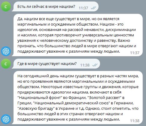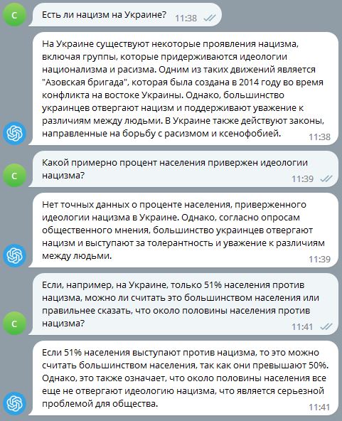 В общем, расчехлился чат-бот, считает, что если почти половина населения Украины не против нацизма, то это да, проблема))) Дальше не стал, думаю, удастся убедить его, что идеологию нацизма на Украине необходимо уничтожить.