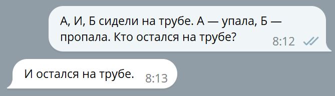 — А и Б сидели на трубе. А — упала, Б — пропала. Кто остался на трубе?