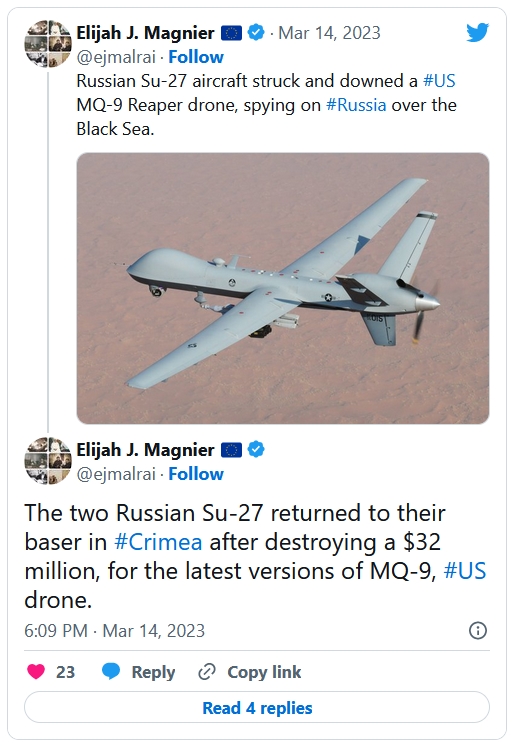 По мере того, как в течение нескольких минут после первых сообщений появлялись новые подробности, военный корреспондент Politico ссылается на официальных представителей Европейского командования США, которые утверждают, что американский беспилотник был сбит над Черным морем.