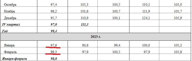 Росстат сообщает, что индекс промпроизводства в феврале 2023 составил 98,3% к февралю 2022. Чтоб понять, что это предвещает по итогам года в целом, просто давайте посмотрим динамику по месяцам прошлого года и первых двух нынешнего: