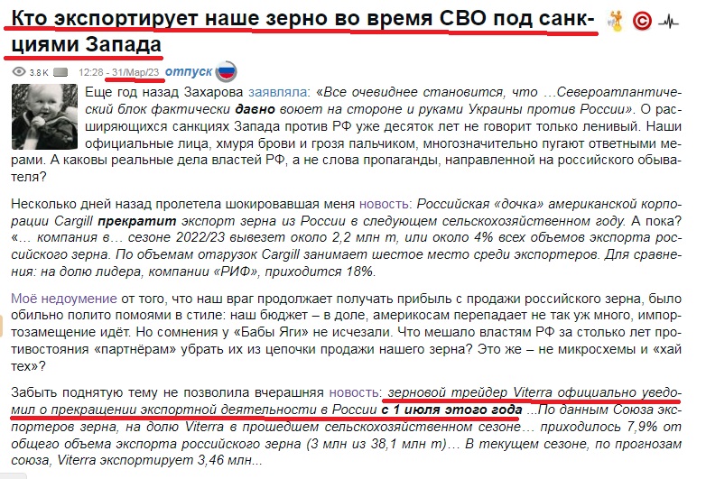 1) Как вы, возможно, знаете, позавчера, 29 марта, сообщила об уходе из торговли российским зерном знаменитая американская Cargill: