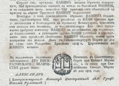 20.03.1808 (2.04). - Манифест Императора Александра I о покорении шведской Финляндии и о присоединении оной навсегда к России.