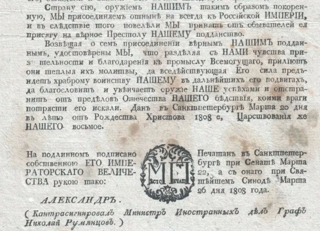 Из деклараций, в свое время изданных, известны праведные уважения подвигнувшие Нас к разрыву с Швецией и к введению войск Наших в шведскую Финляндию. Безопасность отечества Нашего взыскивала от Нас сея меры.