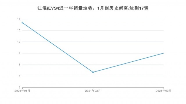 С января по март объем продаж JAC iEVS4 составил 30 единиц, что на 83,78% меньше по сравнению с прошлым годом. Продажи JAC iEVS4 достигли пика в январе 2021 года, когда было продано 17 автомобилей. В марте 2021 года общий объем продаж автомобилей марки JAC достиг 4 103 единиц, из которых объем продаж JAC iEVS4 достиг 9 единиц, что составляет 0,22% от общего объема продаж марки.