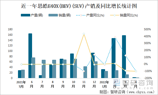 Согласно данным Китайской ассоциации автопроизводителей (CAAM), известно, что: в апреле 2022 года объем производства Sihao E40X(BEV)(SUV) составил 2 единицы, что на 98,6% меньше, чем в прошлом году, а объем продаж - 1 единица, что на 98,9% меньше, чем в прошлом году, а уровень производства и продаж в этом месяце составил 50%; с января по апрель 2022 года совокупный объем производства Sihao E40X составил 338 единиц, что на 23,4% больше, чем в прошлом году, а совокупный объем продаж составил 67 единиц, что на 77,4% меньше по сравнению с прошлым годом; в 2020-2021 годах производство и продажи Sihao E40X(BEV)(SUV) значительно увеличились, и общий объем производства превысил общий объем продаж за последние 2 года, при этом на складе осталось 32 единицы.
