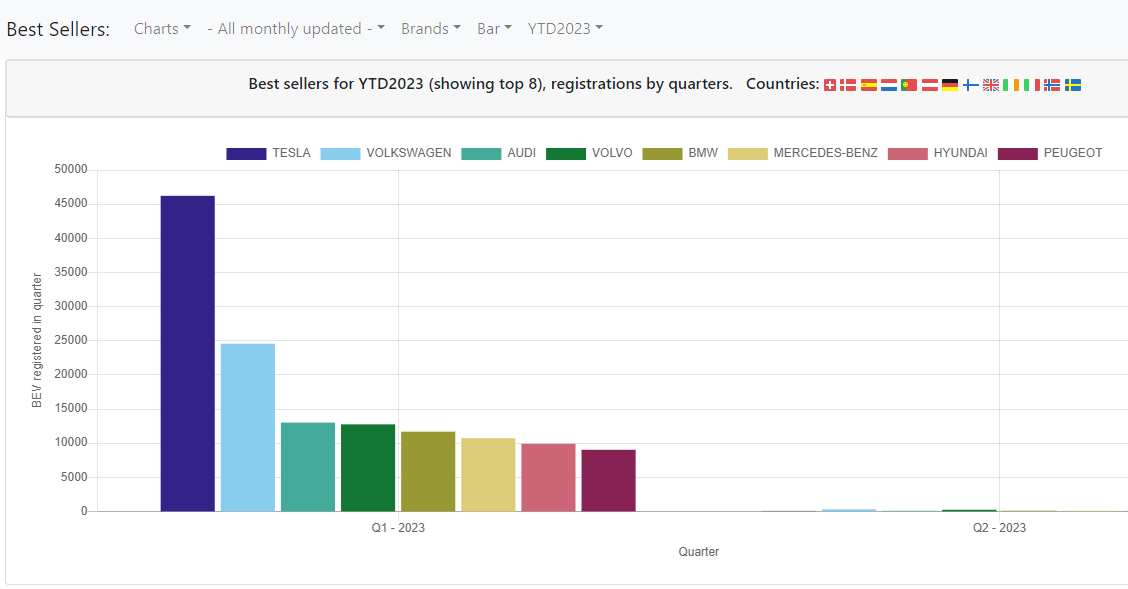 гигафабрика работает - вот цифры продаж электромобилей в Европе за первый квартал 2023 по маркам:
