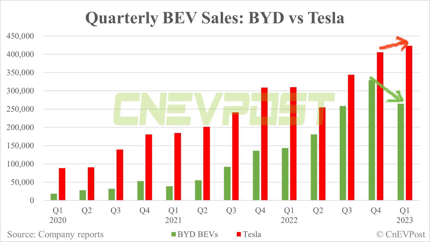 Это некорректное сравнение потому что BYD включает в категорию NEV не только чистые электромобили, но и гибриды.