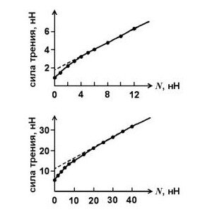 Таким образом, сила трения скольжения микрозонда зависит от площади его контакта с поверхностью, что противоречит классическому закону трения. Оказалось также, что сила трения скольжения не становится нулевой, при отсутствии силы, прижимающей микрозонд к поверхности. Да, это и понятно, так как окружающие микрозонд атомы поверхности так близко к нему расположены, что притягивают его даже в отсутствие внешней силы сжатия. Поэтому и основное предположение классического закона – о прямой пропорциональной зависимости силы трения от силы сжатия – тоже не соблюдается в нанотрибологии.