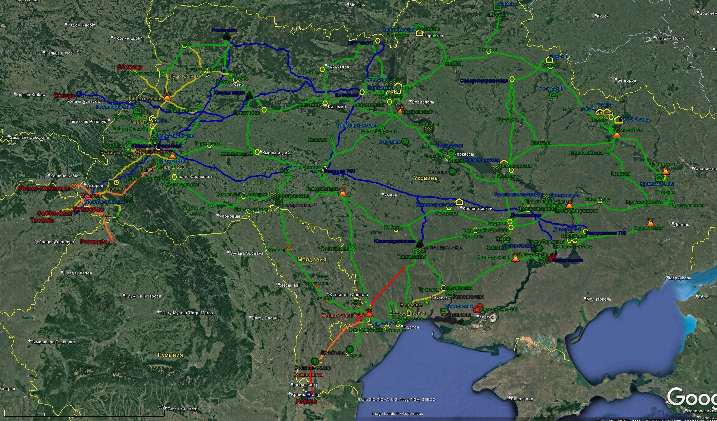 Украинская энергосистема. Синим цветом (линии и подписи) показаны сети 750 кВ, рыжим – 400 кВ, зелёным – 330 кВ, жёлтым – 220 кВ. Красным подписаны заграничные ПС. Жёлтый значок – объект атакован (точно или предположительно), зелёный – нет, рыжий – молдавские подстанции, отключавшиеся из-за общего блэкаута.
