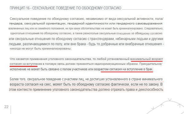 «Что касается применения уголовного законодательства, любой установленный минимальный возраст согласия на секс должен применяться недискриминационным образом. Правоприменение не должно быть связано с полом/гендером участников или возрастом согласия на вступление в брак».