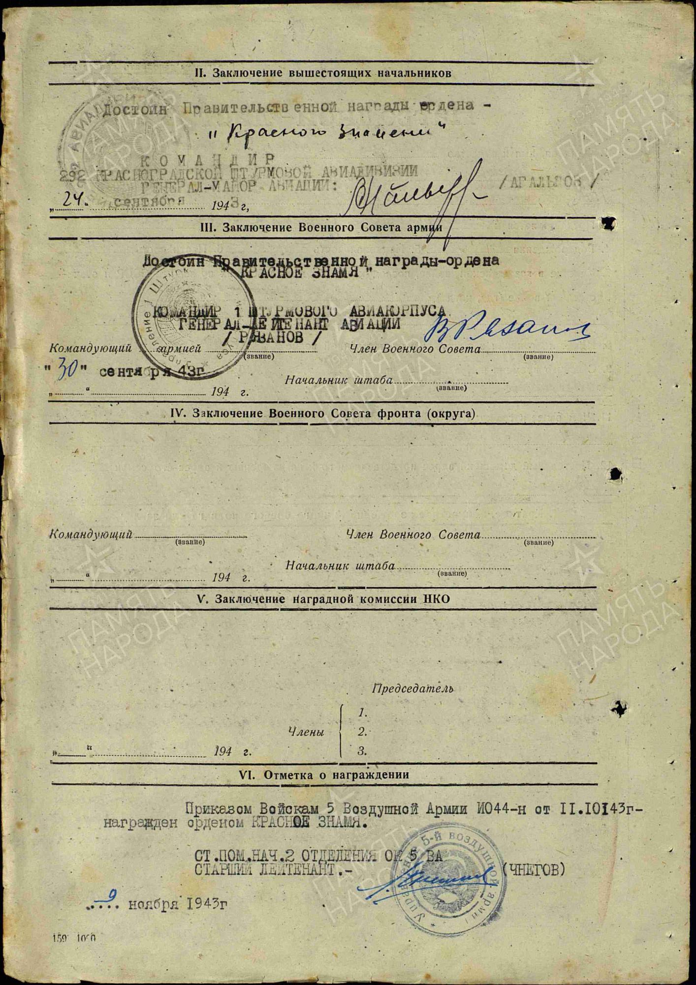 Указом Президиума Верховного Совета СССР от 10 апреля 1945 года за образцовое выполнение заданий командования и проявленные мужество и героизм в боях с немецко-фашистскими захватчиками гвардии лейтенанту