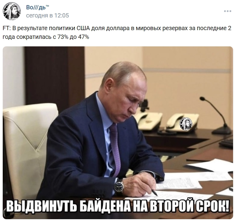 Цифры: доля доллара в мировых резервах составляла 73% в 2001 году, 55% в 2021 году и 47% в 2022 году. Ключевым выводом является то, что в прошлом году доля доллара снижалась в 10 раз быстрее, чем в среднем за последние два десятилетия.