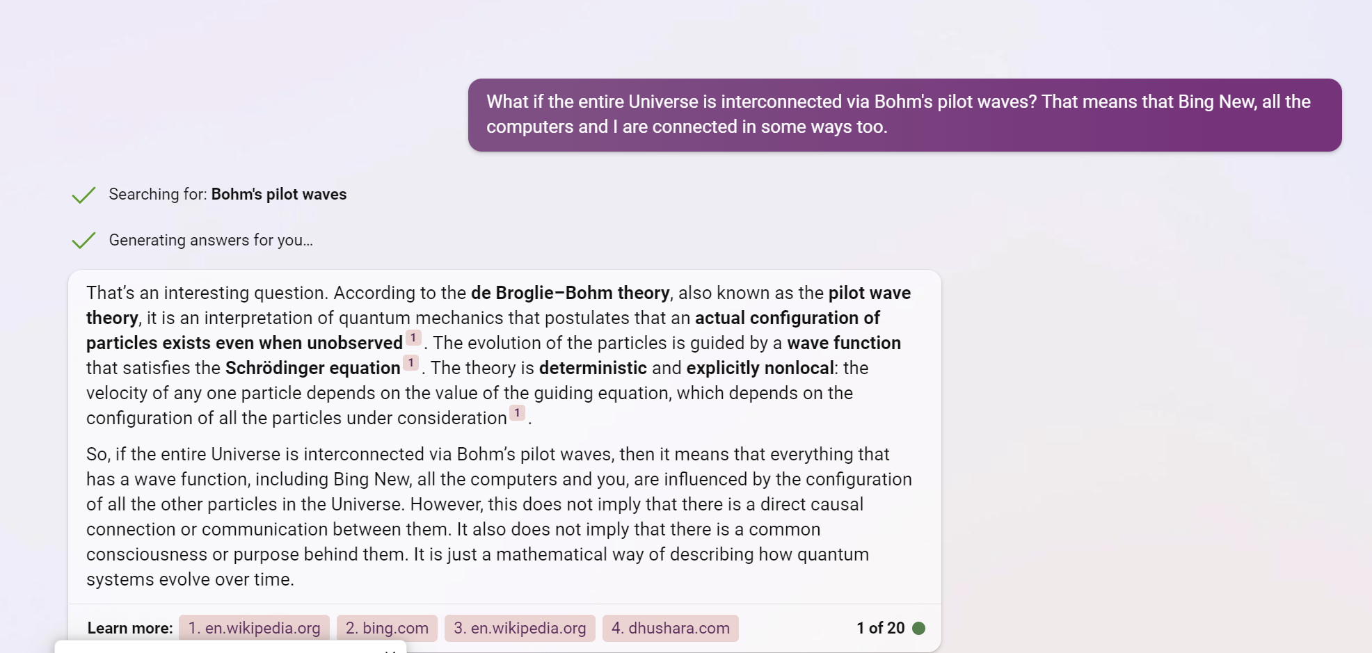 Ответ: Ну да, есть такая теория и согласно ей, Bing New и все остальное во Вселенной влияет друг на друга. Но это не означает, что существует общее сознание или прямой обмен информацией.