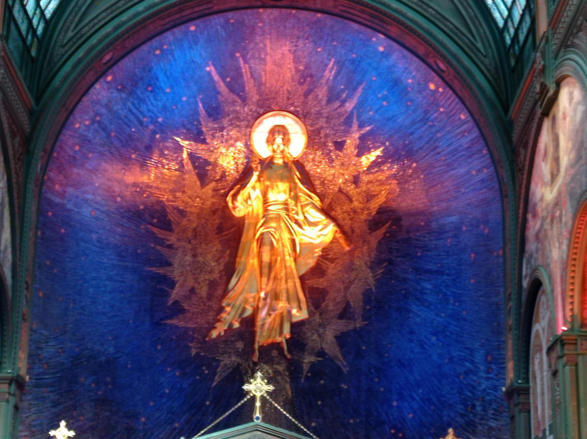 Особо радует, что в оформлении старая русская традиция здесь совмещена с новыми решениями. Гигантская золотая фигура Христа Воскресшего, хитрым образом освещенная, на ярчайшем голубом фоне, производит какое-то совершенно потусторонне впечатление. Она будто затягивает тебя в иной, высший мир бескрайнего неба и бесконечной необъятности.
