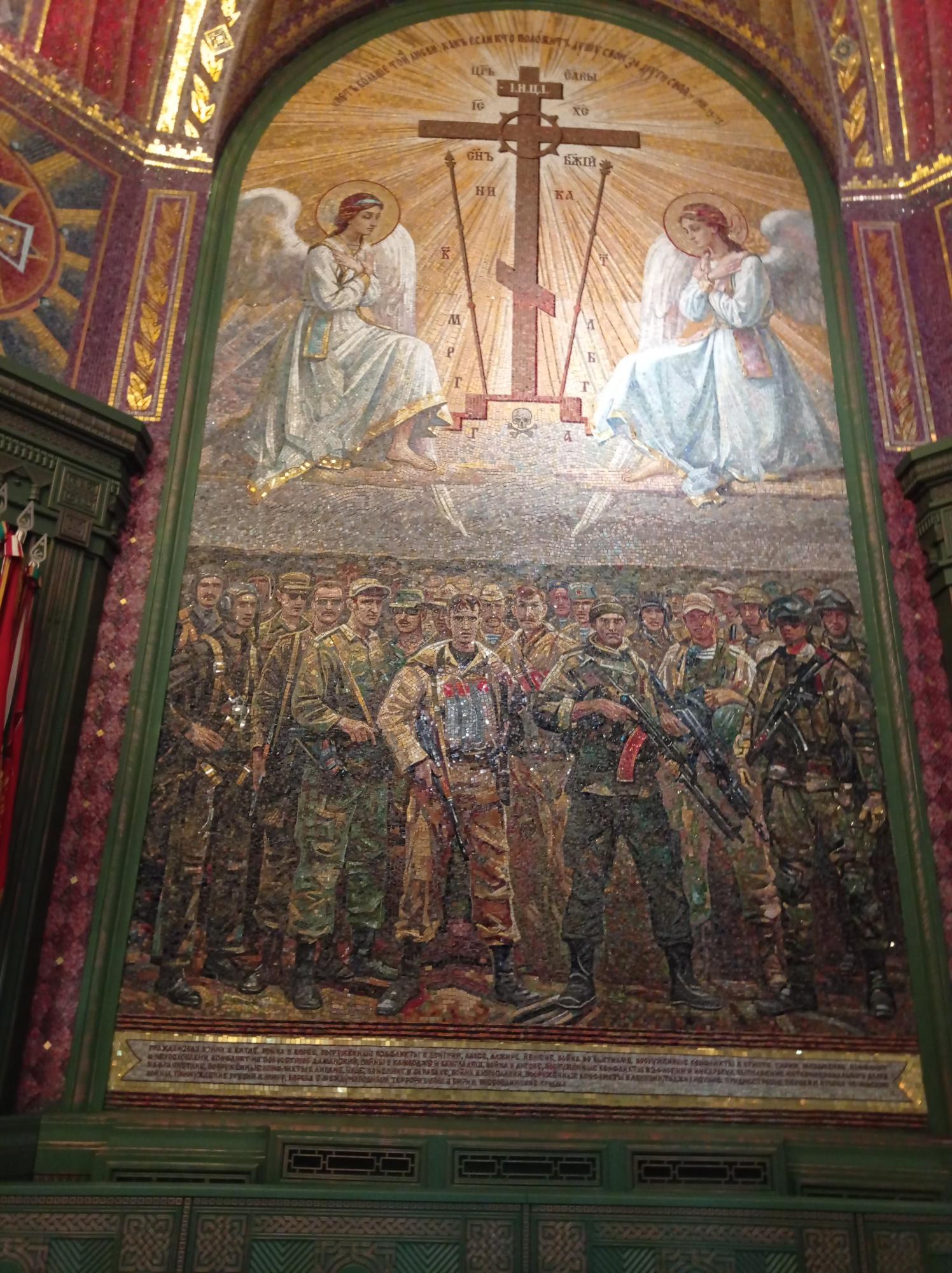 Ну и самое главное. В каждом уголке храма понятно, кем, как и для чего он построен. В нем примирились все эпохи и стили. Иконы, выполненные мастерами, продолжающими чтить традиции древнерусской живописи. Потрясающие мозаики, на которых изображены русские воины, в лучших традициях соцреализма и студии Грекова. С этих мозаичных фресок взирают воины, лица их светлы, уверенны и мудры. С автоматами, гарантами, в полушубках и гимнастёрках, стоят наши защитники, благодаря которым Россия живет и уверенно идет в будущее. И сделано это искренне, красиво, с душой – прямо комок в горле стоит, когда глядишь.