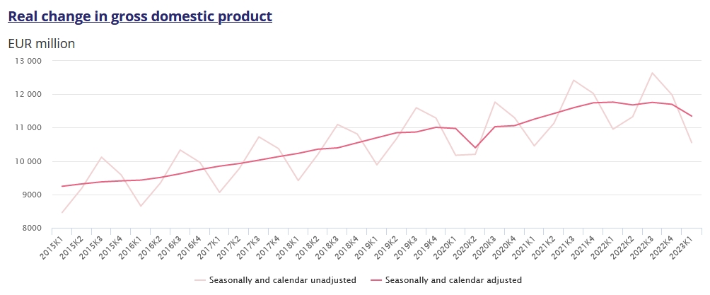 Изменение реального ВВП в первом квартале 2023 года по сравнению с соответствующим кварталом 2022 года было отрицательным и составило -3,7% без учета влияния сезона и рабочих дней и -3,6% с учетом влияния сезона и рабочих дней.