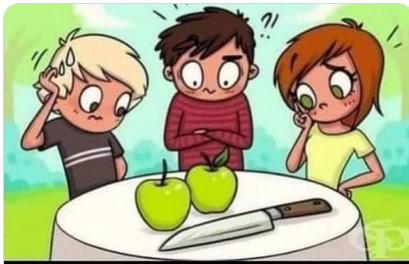 Нож длинный, одним движением отрезать 1/3 у каждого яблока, получиться 3 части по 2/3. Вот всем поровну