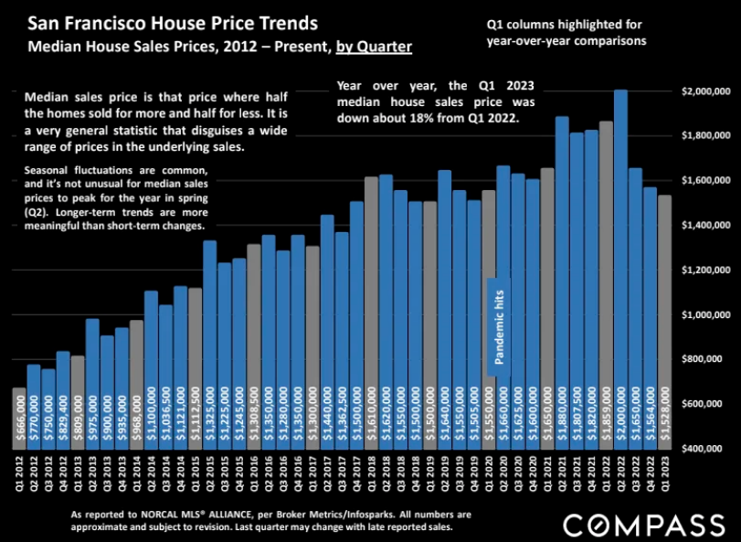 Средние цены на жилье в районе залива выше по сравнению с остальной частью США. Согласно данным, предоставленным Compass, средняя цена продажи дома составляет 1 528 000 долларов в Сан-Франциско и 1 590 000 долларов в Санта-Кларе. Эти цены в четыре раза выше, чем средняя цена в США в размере 375 700 долларов.