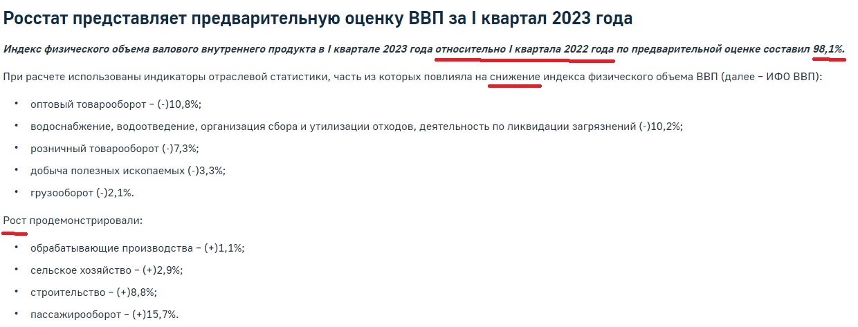 Росстат опубликовал самую предварительную оценку динамики ВВП (уже с учетом, "за вычетом" инфляции, заранее в 100500-й раз объясняю) за 1 квартал 2023.