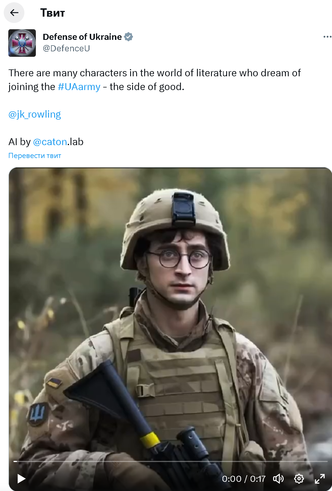 На странице в Twitter военное ведомство опубликовало изображение Поттера в форме украинской армии.