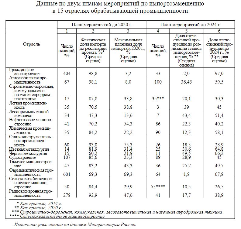 Обращает внимание плохая согласованность (если она вообще есть) между планами по импортозамещению до 20 года и до 24, что автор и отмечает.