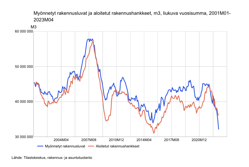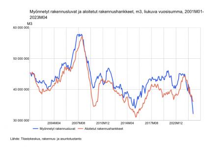Статистическое управление Финляндии сообщает, что сокращение количества выданных разрешений на строительство ускорилось. По данным Статистического управления Финляндии, в период с февраля по апрель 2023 года было выдано разрешений на новое строительство объемом 6,3 млн кубометров, что на 47% меньше, чем годом ранее. Объем начатых и завершенных строительных объектов снизился на 24% по сравнению с прошлым годом.