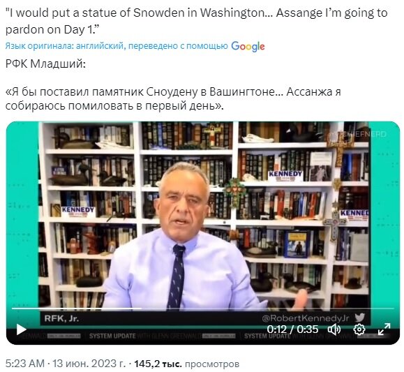 «Вот ответ тем, кто сегодня ноет, что Закон о шпионаже создан для политических преследований», — добавил Лун в поддержку обещаний Кеннеди не только помиловать Сноудена и Ассанжа, но и установить памятник Сноудену в Округе преступников [здесь игра вокруг аббревиатуры DC — District of Columbia/District of Criminals].