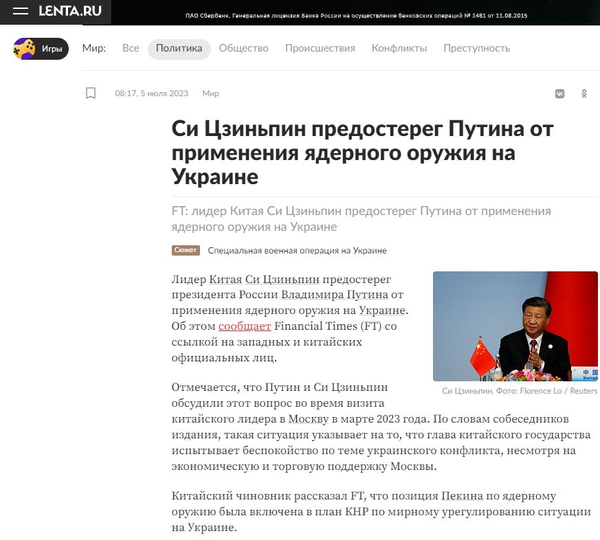 Ну так китайцы неоднократно говорили, и до марта 2023, и в марте, и после, что ядерное оружие не должно быть применено..