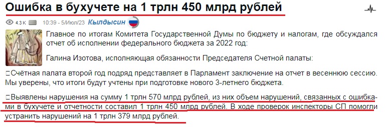 Но вообще я не строю иллюзий. Множество людей на N-ом круге "перепева" новости будет уже просто заявлять: "Вон, триллионами уже из бюджета воруют, не стесняясь! Счётная палата даже признала!"