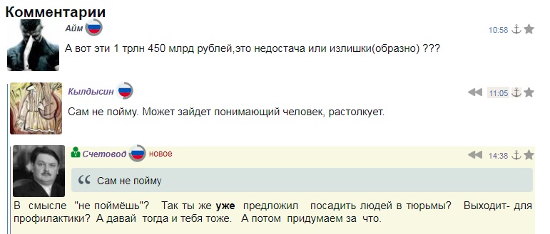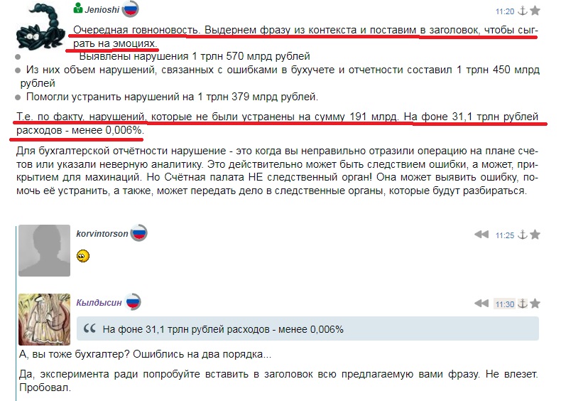 Объективности ради, отмечу: многие читатели восприняли всё вполне адекватно. Эта мулька с записыванием (в интернетах и досужих разговорах обывателей) совокупного объёма ошибок в гигантской бюджетной системе России в "воровство"- уже давно сияющая классика. И потому не все уже это "покупают". Счётная палата каждый год делает такой отчёт и оппозиция каждый раз по новому кругу, но по старой методи(ч)ке напускает туману и начинает усердно подмигивать в стиле "ну мы же понимаем...". От такого повтора одного и того же "прихвата" у многих граждан выработался иммунитет. Они понимают, что выявленные ошибки даже близко не обязаны быть "коррупцией", "воровством" и пр.
